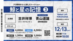 - 【開催レポート】鯨と星の記憶③|26年ぶりの日本一から次世代の台頭まで、語り継がれる「鯨と星」の物語2025年12月13日。冬の足音が聞こえ始めた横浜の街は、どこか凛とした、それでいて温かい空気に包まれていました。相鉄ムービルの一角、ネイキッドロフト横浜の扉を開けると、そこにはベイスターズを愛する皆さんの熱気と、再会を […]